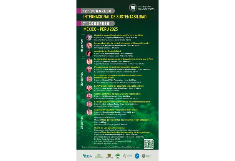 Del 19 al 21 de noviembre, la Universidad Ricardo Palma será sede del 12.º Congreso Internacional de Sustentabilidad y 7.º Congreso México–Perú 2025, un encuentro académico que congregará a expertos nacionales e internacionales para reflexionar sobre los desafíos ambientales, económicos y geopolíticos que enfrenta el mundo.