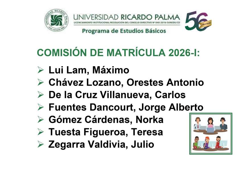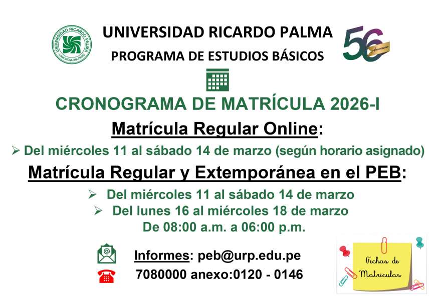 Cumpliendo con las Condiciones Básicas de Calidad (CBC) establecidas por la Superintendencia Nacional de Educación Superior Universitaria (SUNEDU), el Programa de Estudios Básicos invita a los futuros ingresantes a formar parte de la Universidad Ricardo Palma, institución con más de medio siglo de trayectoria académica, dedicada a la formación de profesionales de alto nivel, ciudadanos con conciencia ética, democrática y comprometidos con el desarrollo del país.